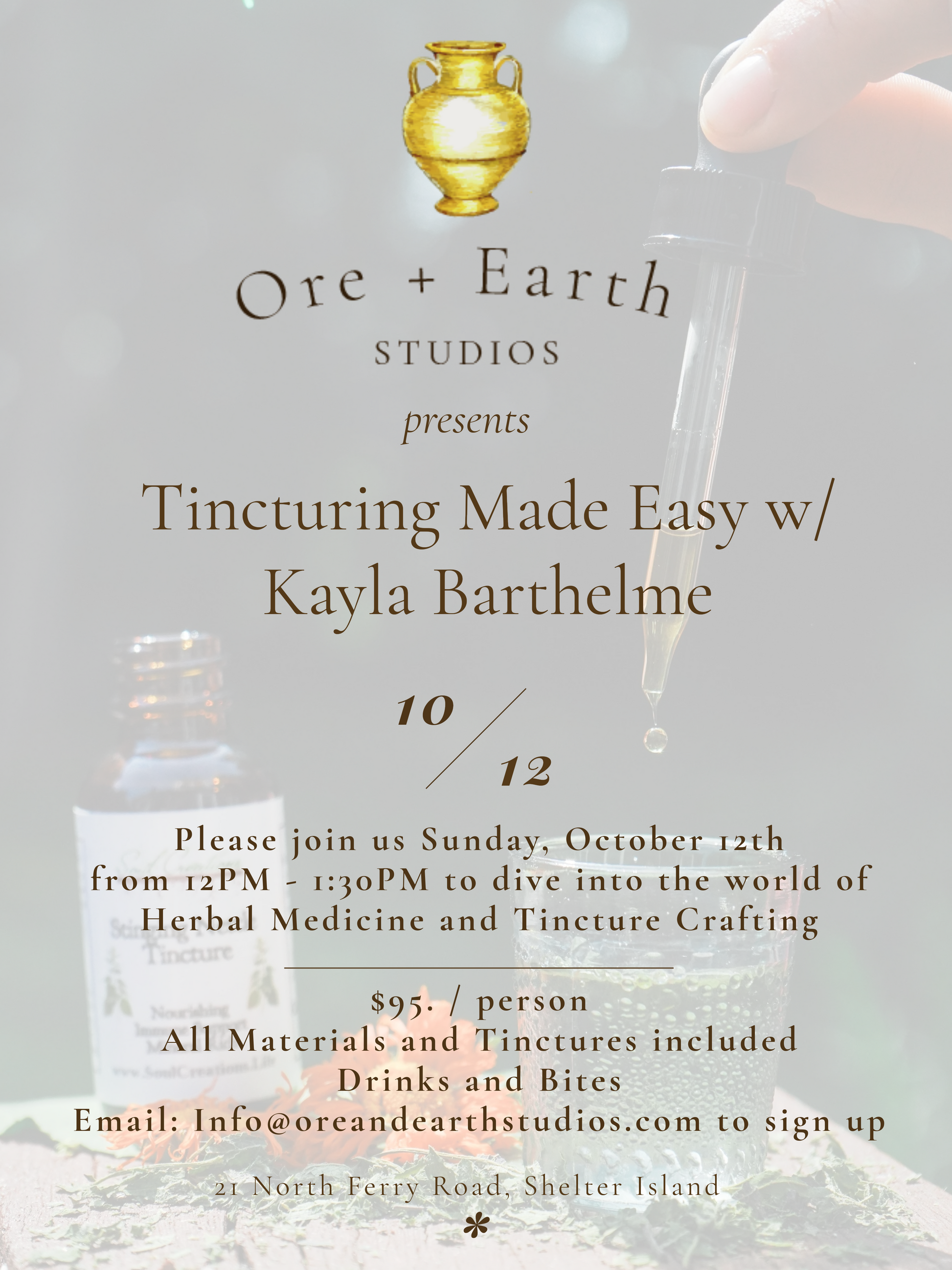 Ready to dive into the world of herbal medicine but not sure where to start? Join us for this fun and hands-on 1.5-hour workshop designed especially for beginners! You’ll learn how to craft your own tinctures using fresh herbs and 100 proof vodka. We'll walk through techniques for common herbs, discuss safe dosage practices, and demystify the tincturing process so you can confidently make your own plant medicine at home. Every participant will go home with a handmade tincture, a dosage bottle, a detailed handout, and the empowering knowledge to keep creating long after class ends. Come get crafty with your wellness and connect with the magic of herbs! 🌱
